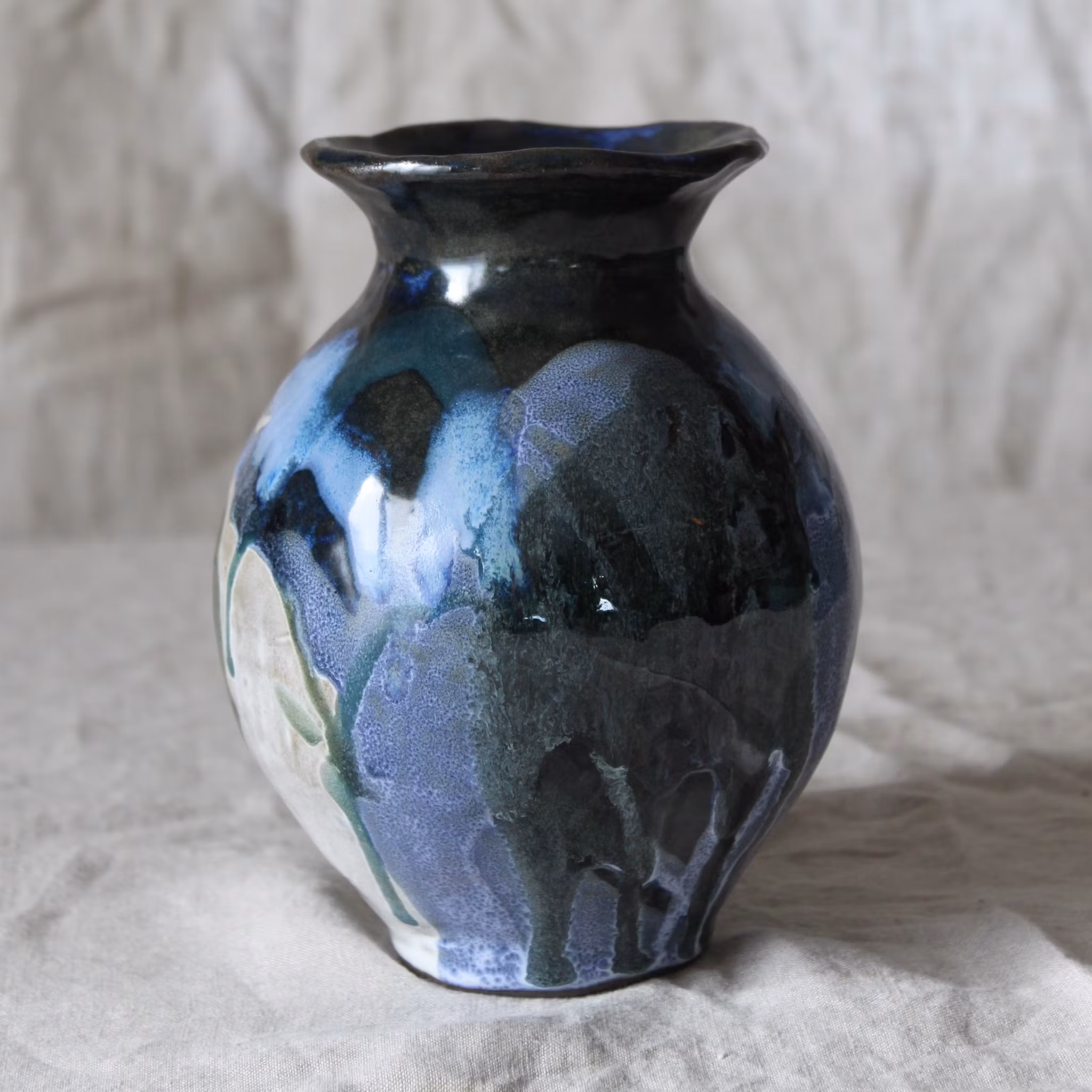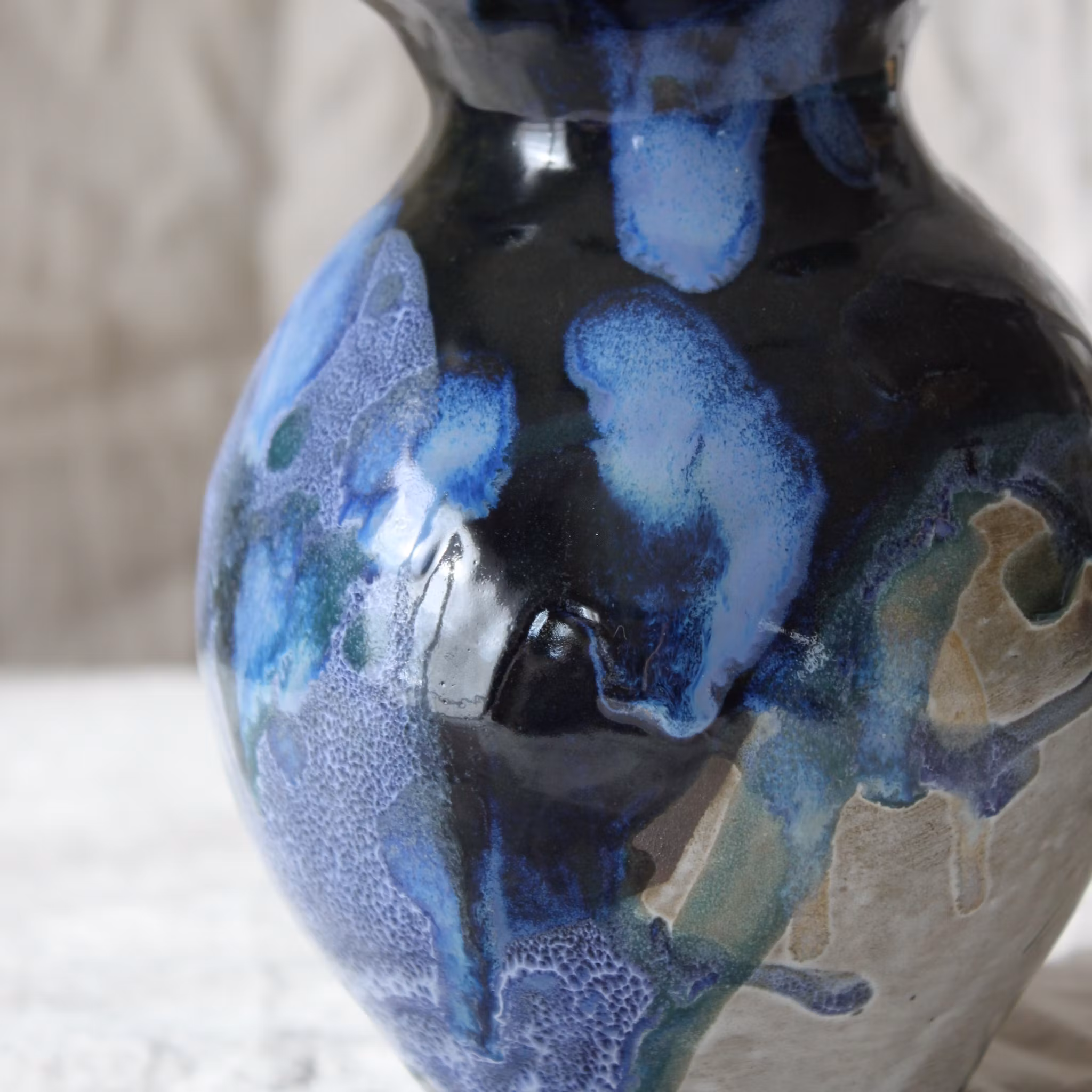 Vas i havsglasyr. Blank, flerfärgad. Höjd ca 17 cm.