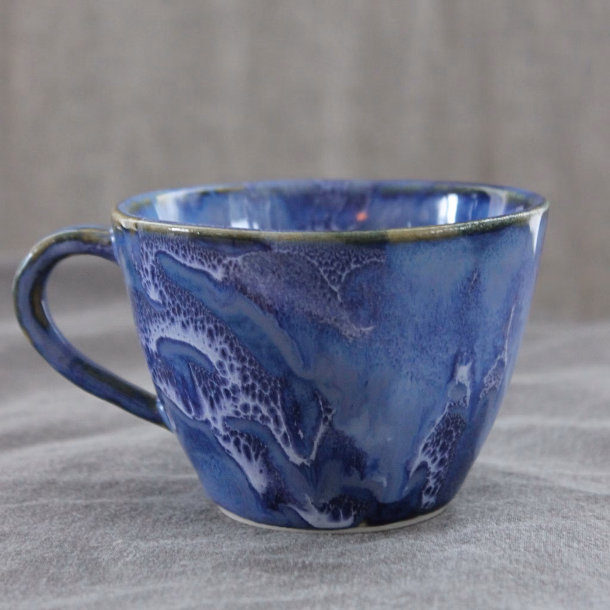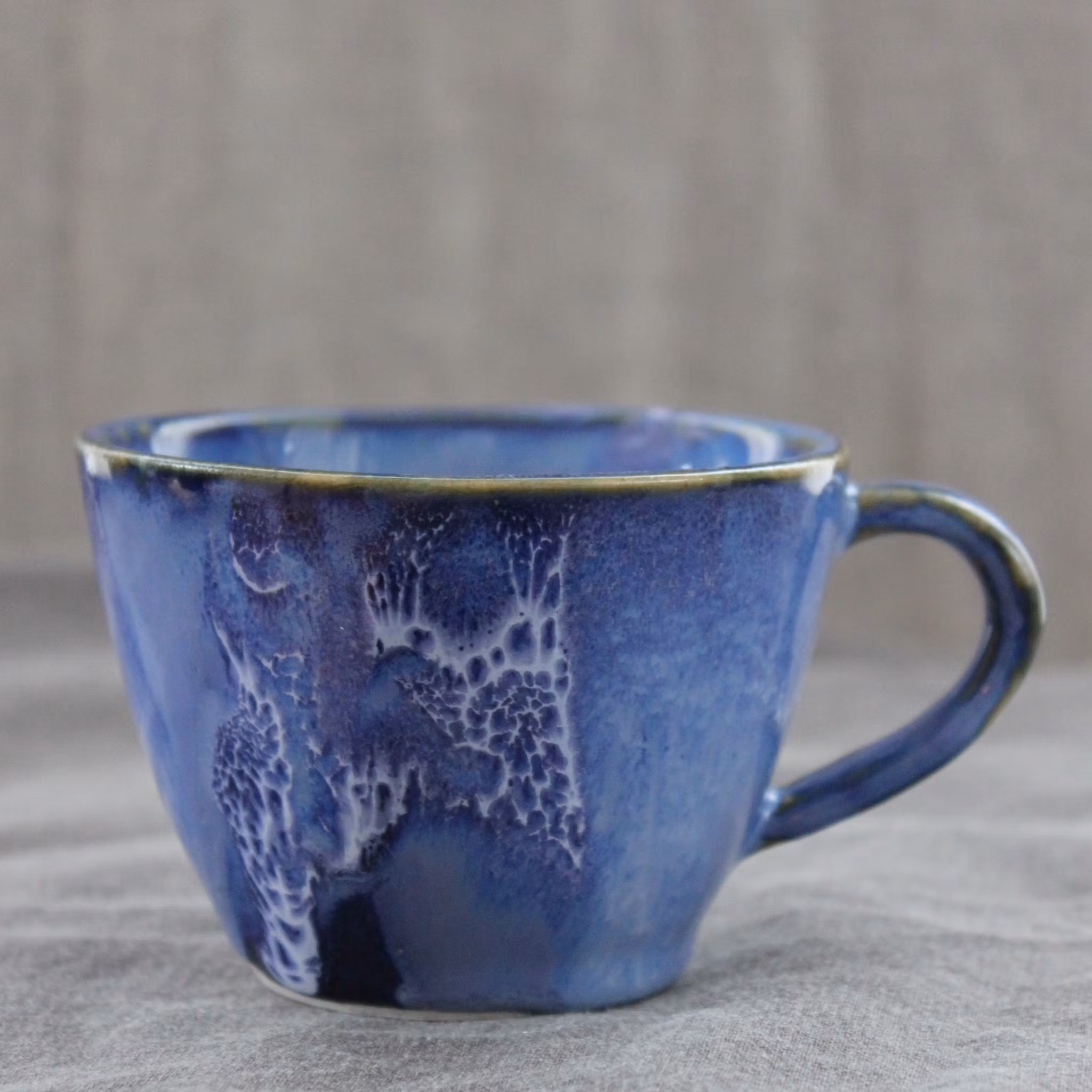 Kopp i blå havsglasyr, blank. Nätt kaffestorlek, höjd ca 6,5 cm.