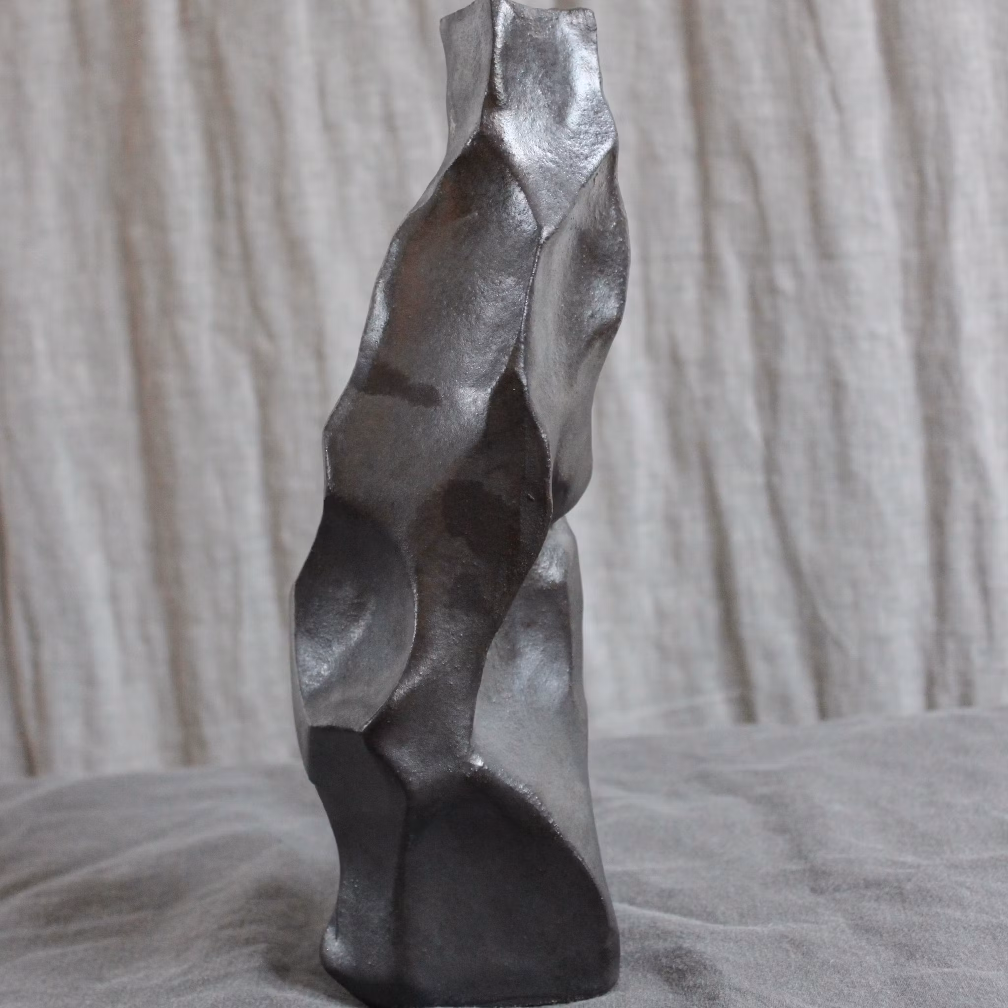 Skulptural vas i stengods. Blank, metallisk utsida. Höjd 25 cm.