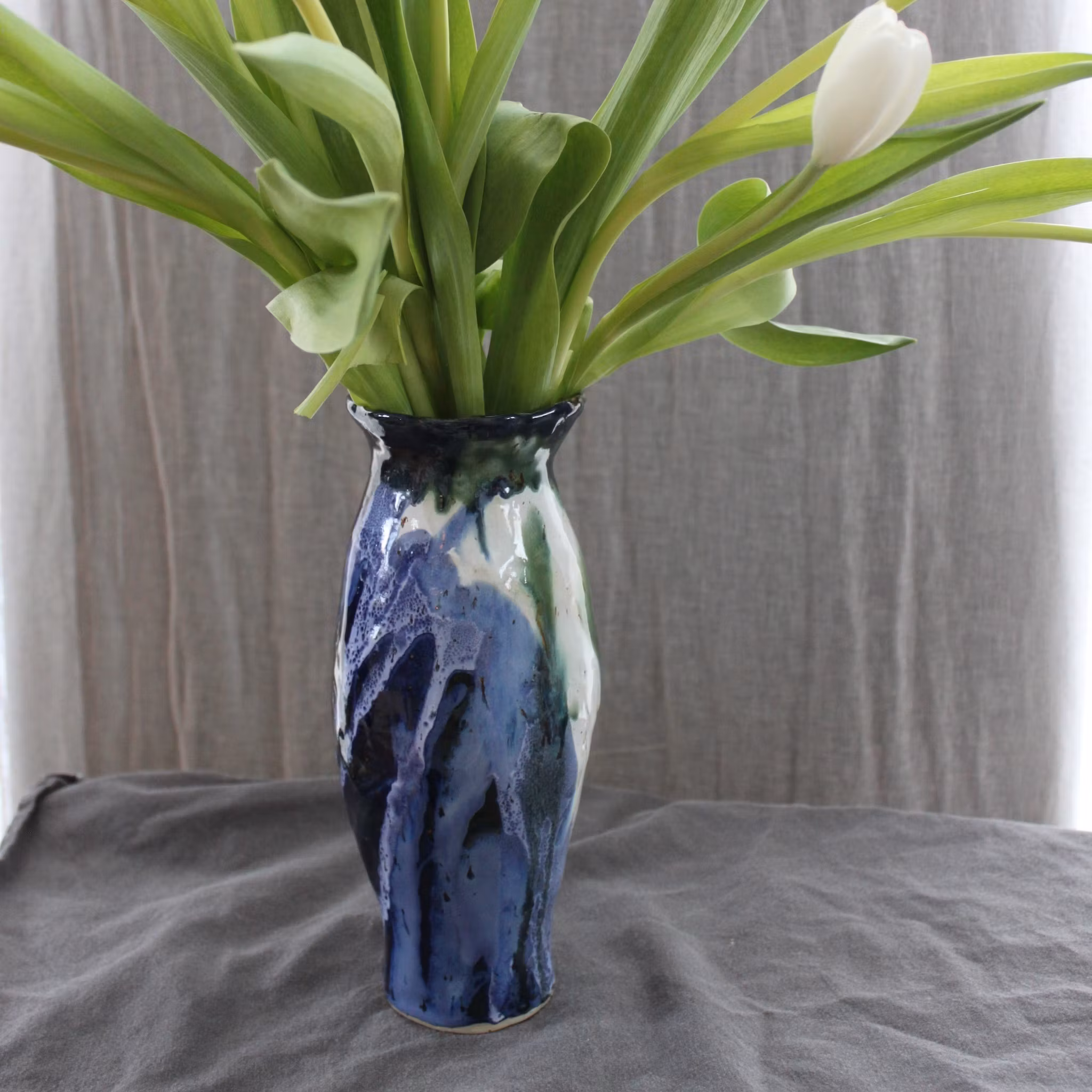 Vas i havsglasyr. Blank, flerfärgad. Höjd 25 cm.
